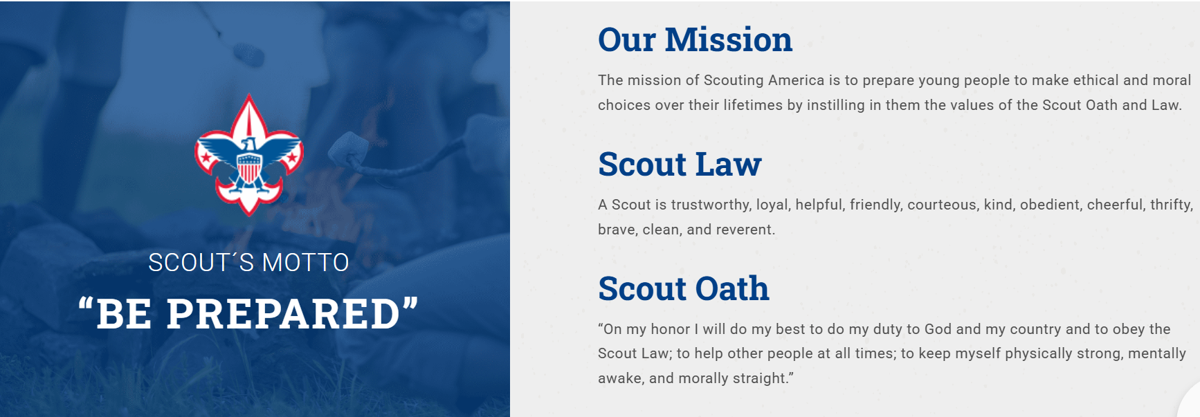The philosophy of Scouting and our troop leaders is for the troop to be "youth-led" and the role of adults is to support the Scouts. By using an outdoor environment, the patrol method, advancement, and the exposure to adults of good character, the program teaches the ideals spelled out in the Scout's motto, Law, and Oath.